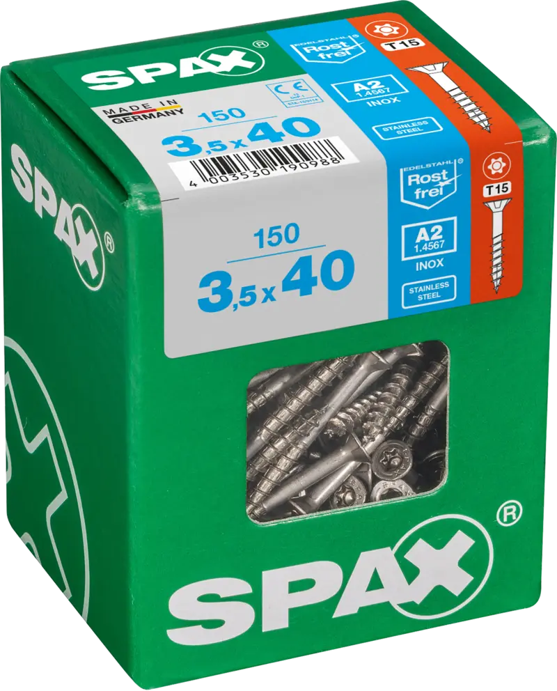 SPAX Edelstahlschraube, 3,5 x 40 mm, 150 Stück, Teilgewinde, Senkkopf, T-STAR plus T15, 4CUT, Edelstahl rostfrei A2, 4197000350407