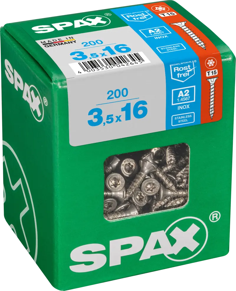 - Die SPAX Edelstahl rostfrei bietet Sicherheit gegen Korrosion!