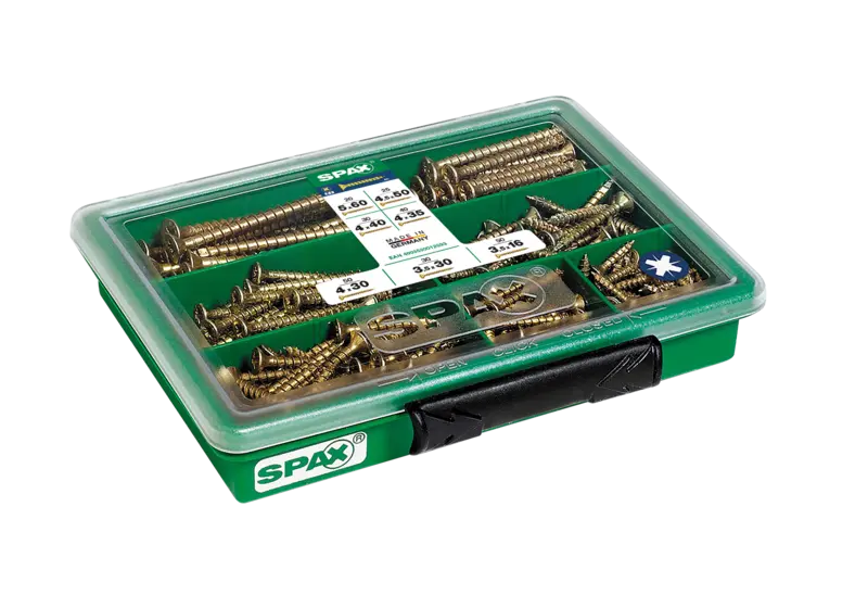 Der kleine Sortimentskasten enthält Schrauben in 7 verschiedenen Abmessungen, alle ausgestattet mit unseren Innovationen Senkkopf und YELLOX-Beschichtung, außerdem mit dem Kreuzschlitz Z-Antrieb. Der Sortimentskasten ist das ideale Notfall-Set für Werkstatt und Haushalt. Das bedeutet für Sie: Nie wieder Schrauben suchen, Sie haben alle wichtigen Abmessungen immer ordentlich und griffbereit zur Hand. Der Kasten ist kompakt und gut zu verstauen.