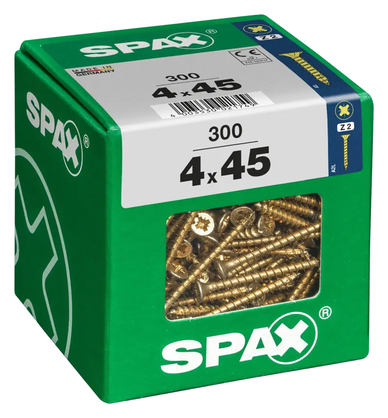 Die Universalschraube ist der absolute Allrounder im Sortiment von SPAX. Sie kann fast alles – zum Beispiel ganz ohne Vorbohren in Nadelhölzer wie Fichten- und Kiefernholz sowie in die gängigen Holzwerkstoffplatten (MDF, Span- und OSB-Platten) eingedreht werden. Dabei spielt unsere Universalschraube ihre Überlegenheit vor allem im Innenausbau- und Möbelbaubereich aus, aber auch außen ist sie mit dem passenden Korrosionsschutz gut verwendbar. Durch ihre besondere Gewindegeometrie ist der Eindrehwiderstand beim Schrauben wesentlich geringer als bei herkömmlichen Schrauben, was nicht nur Ihre Kräfte und Nerven, sondern auch den Akku des eingesetzten Schraubers schont. Ein Aufspleißen des Holzes in Randnähe wird zuverlässig unterbunden. Das bedeutet für Sie: Sie drehen mehr Schrauben pro Akkuladung ein, und Sie müssen sich keine Sorgen um aufgerissene Holzenden mehr machen.