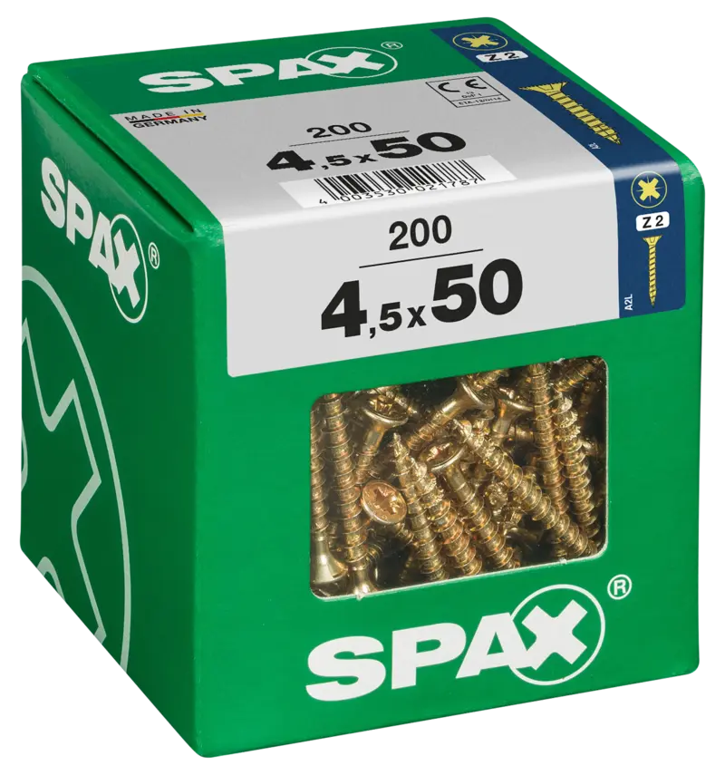 Die Universalschraube ist der absolute Allrounder im Sortiment von SPAX. Sie kann fast alles – zum Beispiel ganz ohne Vorbohren in Nadelhölzer wie Fichten- und Kiefernholz sowie in die gängigen Holzwerkstoffplatten (MDF, Span- und OSB-Platten) eingedreht werden. Dabei spielt unsere Universalschraube ihre Überlegenheit vor allem im Innenausbau- und Möbelbaubereich aus, aber auch außen ist sie mit dem passenden Korrosionsschutz gut verwendbar. Durch ihre besondere Gewindegeometrie ist der Eindrehwiderstand beim Schrauben wesentlich geringer als bei herkömmlichen Schrauben, was nicht nur Ihre Kräfte und Nerven, sondern auch den Akku des eingesetzten Schraubers schont. Ein Aufspleißen des Holzes in Randnähe wird zuverlässig unterbunden. Das bedeutet für Sie: Sie drehen mehr Schrauben pro Akkuladung ein, und Sie müssen sich keine Sorgen um aufgerissene Holzenden mehr machen.