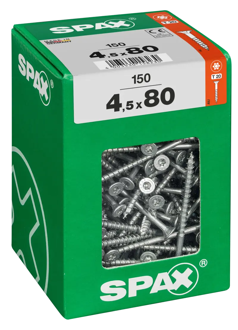 SPAX Universalschraube, 4,5 x 80 mm, 150 Stück, Teilgewinde, Senkkopf, T-STAR plus T20, 4CUT, WIROX, 4191010450806