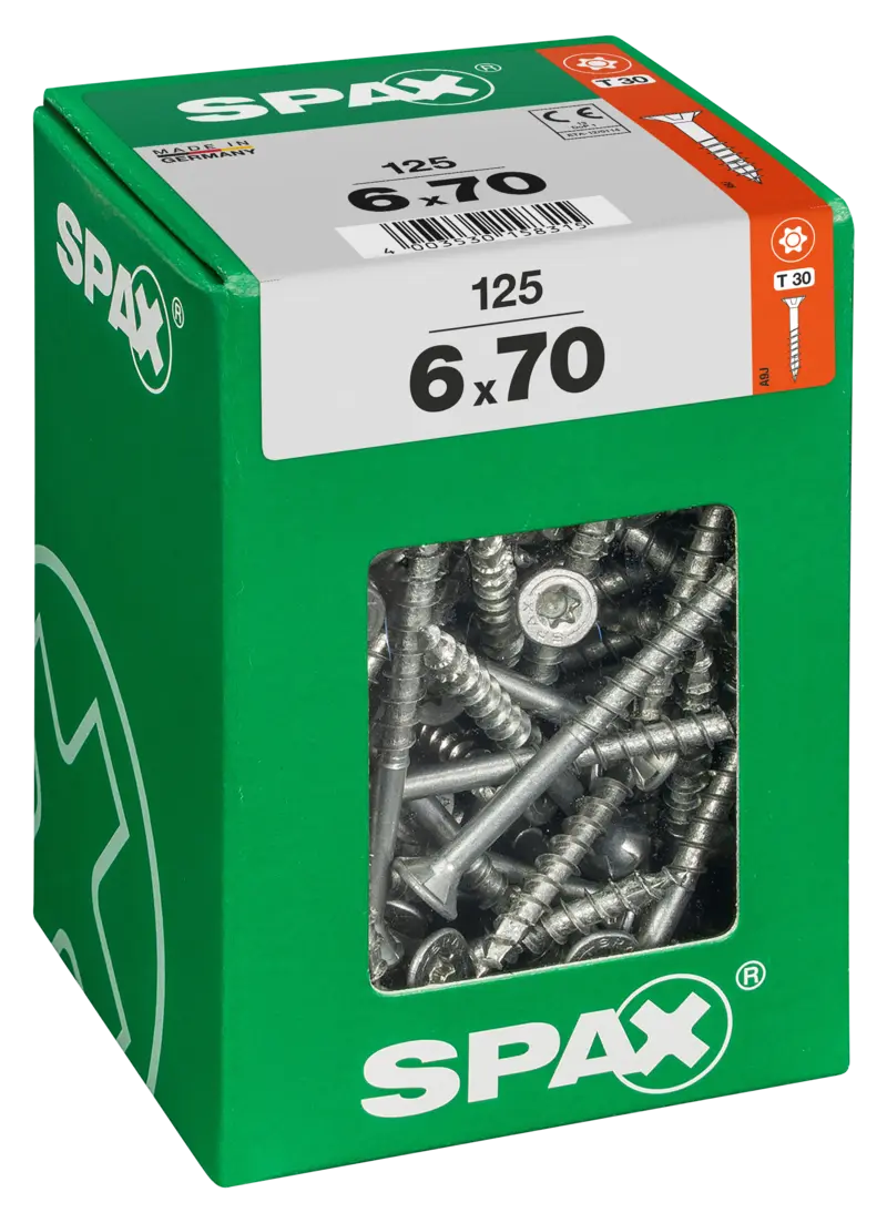SPAX Universalschraube, 6 x 70 mm, 125 Stück, Teilgewinde, Senkkopf, T-STAR plus T30, 4CUT, WIROX, 4191010600706