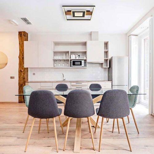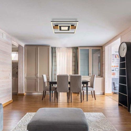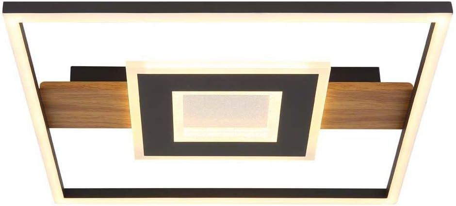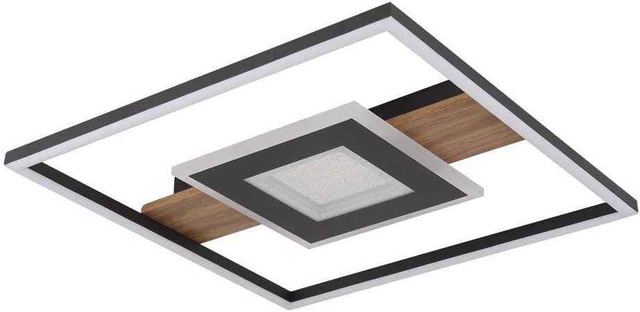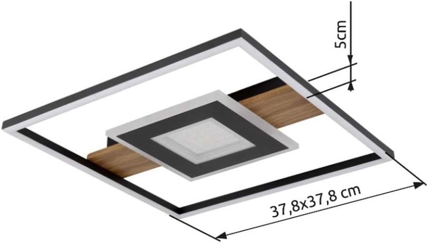 Die Deckenleuchte PIKARA beeindruckt durch ihr markantes, quadratisches Design mit zwei übereinander angeordneten Quadraten. Der Korpus besteht aus einer stilvollen Kombination von Metall in Holzoptik und mattschwarzem Finish, was der Leuchte einen modernen und natürlichen Look verleiht. Der Schirm aus mattem, schwarzem Aluminium und opalem Acryl sorgt für eine angenehme, gleichmäßige Lichtverteilung, während klare Acrylkristalle funkelnde Akzente setzen. Mit ihren Maßen von 378 x 378 mm und einer Helligkeit von 800 Lumen bietet die PIKARA Deckenleuchte sowohl funktionales Licht als auch eine ansprechende Optik. Die warmweiße Lichtfarbe von 3000 K schafft eine gemütliche Atmosphäre, ideal für Wohnzimmer, Schlafzimmer oder Flure. Diese LED-Deckenleuchte vereint modernes Design mit hoher Funktionalität und wird durch ihre hochwertigen Materialien und ihr zeitgemäßes Erscheinungsbild zu einem stilvollen Blickfang in jedem Raum.
