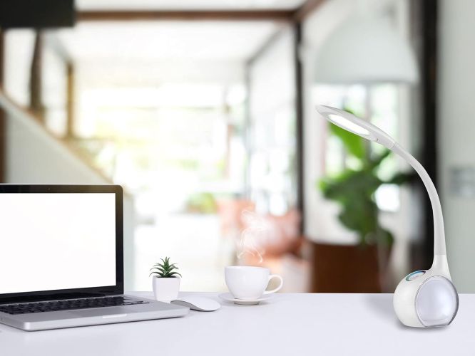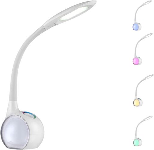 Das schlichte Design dieser weißen Acryl Tischlampe überzeugt sobald sie eingeschalten wird. Sie spendet über einen Strahler, welcher auf einem flexiblen Arm befestigt ist, ein 280 Lumen starkes und 5500K kaltweißes Licht. Doch das Besondere der Lampe ist der beleuchtete Sockel, dieser besitzt einen Farbwechsler, welcher die Farben auch fixieren kann und einen Touchdimmer. Sie hat außerdem eine Höhe von 53 cm.