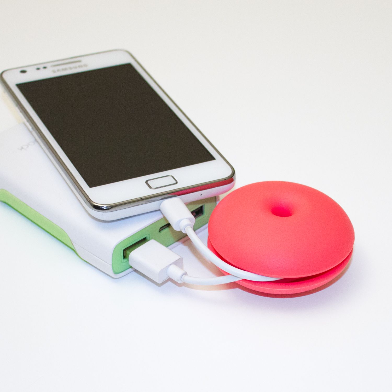 Donut öffnen und Kabel / Kopfhörer so aufrollen, dass alle Teile geschützt im Inneren verstaut sind. TIPP: um lange Kabel zu "kürzen", Kabeln mittig zusammenlegen und so aufwickeln, dass nur die Enden aus dem Donut herausragen - ideal für die Kombination Smartphone & Powerbank.