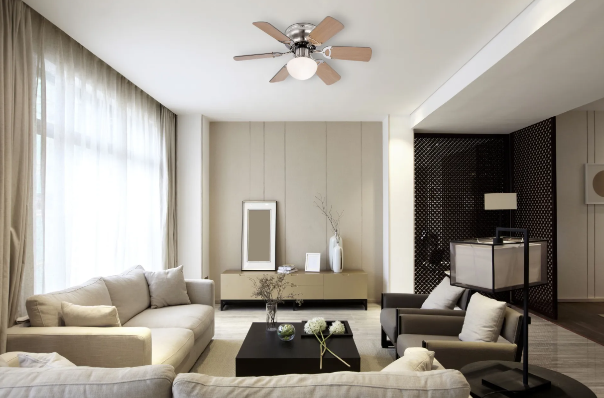Im Sommer wie im Winter sorgt dieser klassisch designte Deckenventilator für eine effiziente Luftumwälzung im Raum. Dieses Modell zeugt von einer einfachen Bedienung durch einen Zugschalter, mit dem man in drei verschiedenen Stufen regulieren kann. Aufgrund seines Durchmessers von 76 cm kann dieser Ventilator problemlos bei Raumgrößen bis zu 12 m2 eingesetzt werden. Materialien wie Chrome und Glas wurden bei diesem Modell verwendet. Die sechs formschönen wendbaren Rotorblätter sind auf einen Seite ahornfärbig und auf der anderen in Gaphitoptik gehalten und können je nach Belieben verwendet werden.
