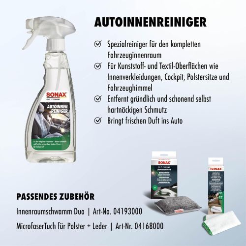 AutoInnenReiniger auf die verschmutzten Flächen sprühen und mit einem Schwamm, einer Bürste oder SONAX MicrofaserTuch für Polster + Leder (Art.Nr. 04168000) behandeln. Den gelösten Schmutz mit einem sauberen und feuchten Microfasertuch aufnehmen, zwischendurch das Tuch mit klarem Wasser auswaschen. Vorgang so lange wiederholen, bis kein Schmutz mehr im Tuch sichtbar ist.