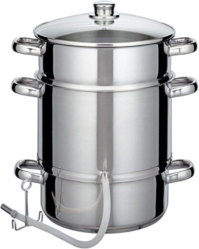 - 4-teilig: Edelstahltopf, Glasdeckel, Entsafterschlauch mit Klemme, Fruchteinsatz