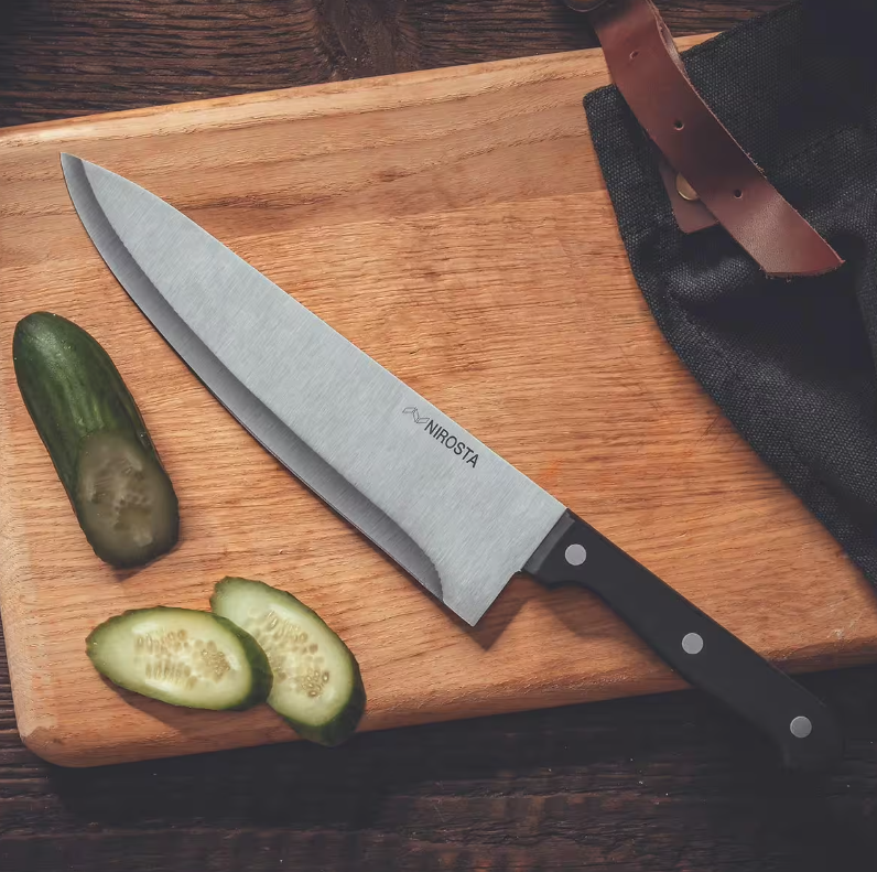 Ein gutes Messer ist unverzichtbar und macht das Kochen gleich viel angenehmer und spaßiger. Das Kochmesser von Nirosta (32 cm) ist ein Klassiker und der ideale Helfer bei der Zubereitung von Gemüse, Obst, Fleisch und Fisch. Der ergonomische Griff liegt bei der Verwendung gut in der Hand und unterstützt die scharfe Klinge aus Edelstahl beim Schneiden von Lebensmitteln aller Art. Die Klinge mit einer Länge von 20 cm ist nicht nur rostfrei, sondern bleibt auch lange scharf. So wird Kochen zum Erlebnis. Nach Gebrauch kann das Messer ganz einfach per Hand gereinigt werden.