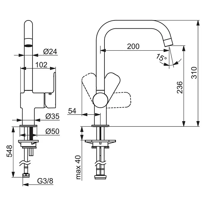 - Ausladung Armatur: 200 mm