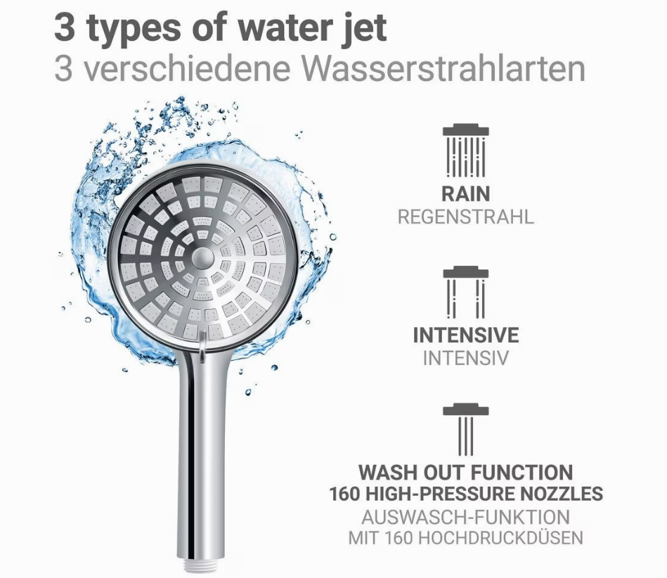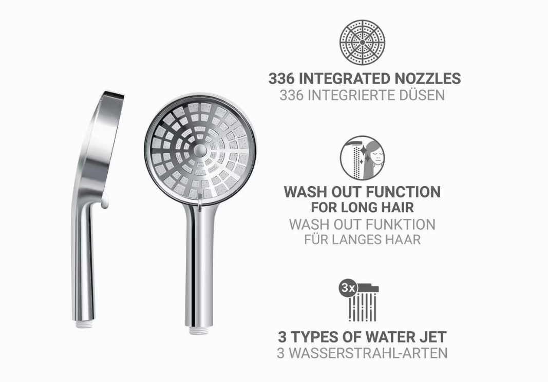 - Hochdruckduschkopf mit 160 Düsen für gründliches Auswaschen der Haare