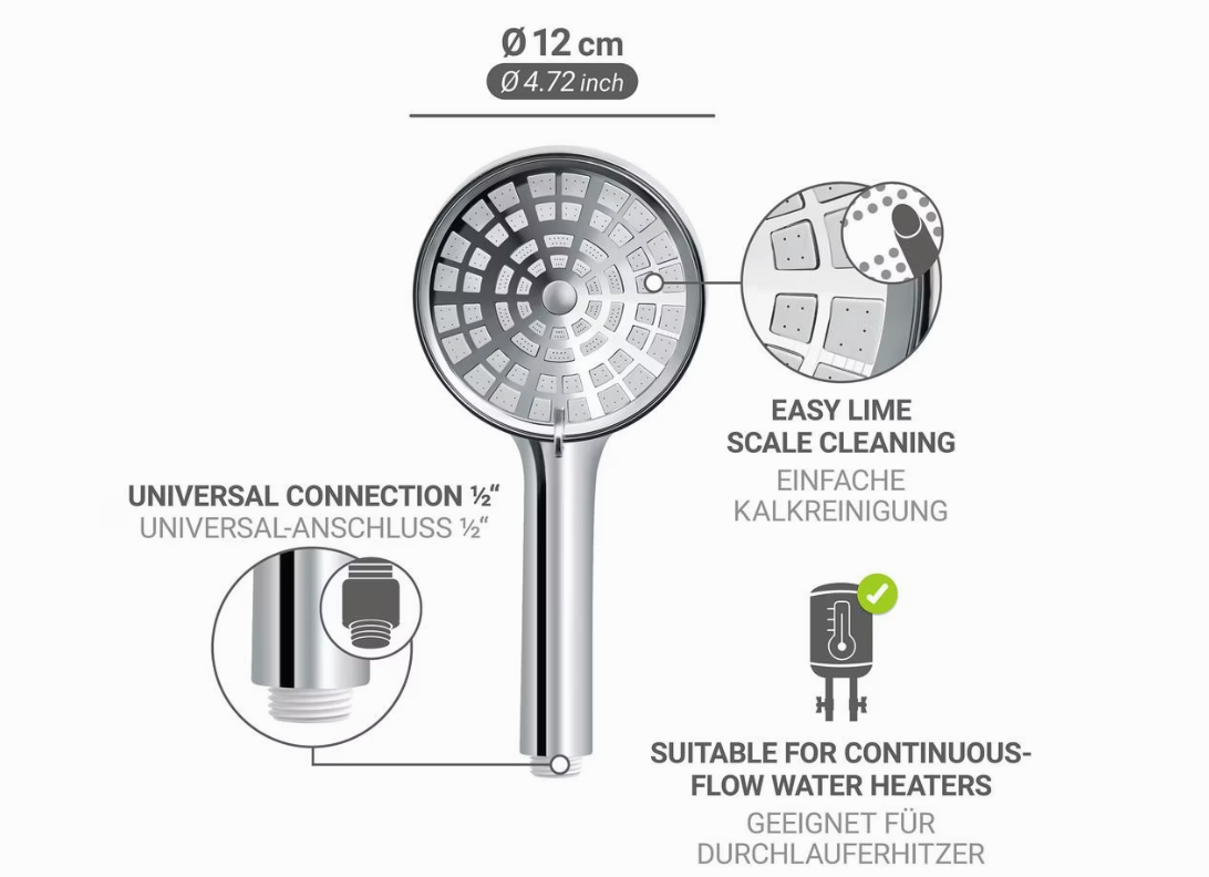 - Langlebiger ABS Duschkopf, ideal für Durchlauferhitzer geeignet