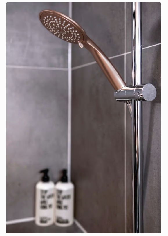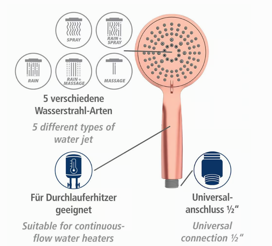 Das innovative Duschkopf-Sortiment von WENKO überzeugt durch Funktionalität, Design und Qualität und verwandelt Ihr Badezimmer in eine Wellness-Oase. Gönnen Sie sich den Luxus einer Regendusche mit dem Duschkopf Young in der Trendfarbe Rosegold. Ein sanfter, angenehmer Tropenschauer entspannt Sie beim Duschen. Und das ist nur eine Funktion, die die clevere Handbrause zu bieten hat. Neben diesem wohltuenden Wasserstrahl können Sie noch zwischen vier weiteren Strahlarten wählen: Genießen Sie die belebende Massage- oder die spritzige Sprühfunktion sowie Kombinationen aus verschiedenen Strahl-Arten in Ihrer bevorzugten Wasserstrahlstärke. Dabei ist der hochwertige Duschkopf aus stabilem ABS mit praktischen Noppen ausgestattet, die für eine einfache Kalkreinigung sorgen und so eine langlebige Nutzungsdauer garantieren. Eventuelle Kalkablagerungen an den Düsen können einfach mit den Fingern abgerieben werden. Die trendige Duschbrause verfügt über einen Universalanschluss mit ½“ und ist natürlich auch für Durchlauferhitzer geeignet. Alle Handbrausen der Trendlinie Young verfügen über eine separate, innenliegende Wasserführung und sind selbstverständlich nach KTW und W270 Leitlinie produziert. Den dazugehörigen Duschschlauch sowie passende Accessoires hat WENKO auch im Sortiment. Kombinieren Sie doch Ihren neuen Duschkopf mit den Accessoires der Bad-Serie Glimma.
