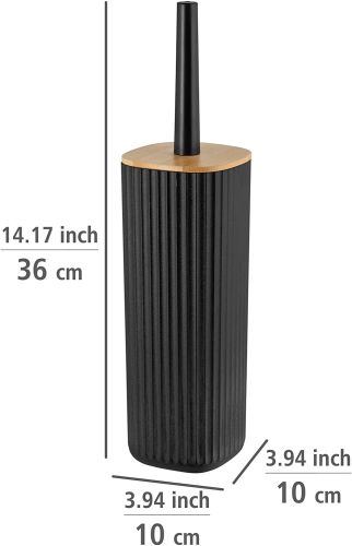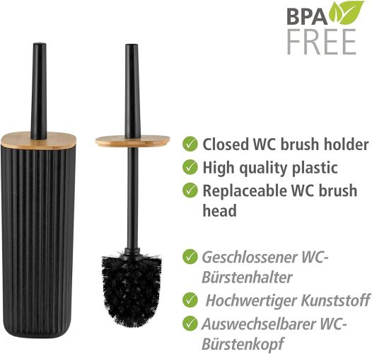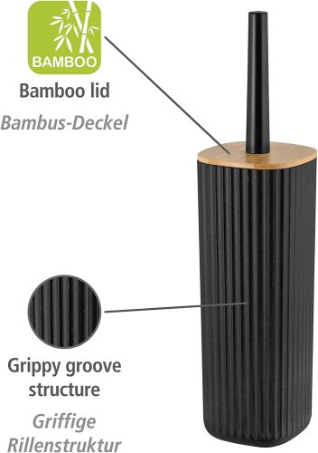 Hier trifft modernes Design auf natürliche Details: Die Bad-Serie Rotello von WENKO kombiniert hochwertigen Kunststoff mit dem schnell nachwachsenden Rohstoff Bambus. So auch bei der WC-Garnitur Rotello. Der schwarze Behälter und der Deckel im Hellbraun des Bambus ergänzen sich zu einem modernen, unaufdringlichen Bad-Accessoire. Der am WC-Bürstengriff befestigte Bambus-Deckel verleiht dem nützlichen Utensil das gewisse Etwas und verschließt den Behälter blickdicht. Die WC-Garnitur Rotello sorgt für eine einfache Reinigung Ihres WCs und trägt so zu einem hygienischen Umfeld in Ihrem Badezimmer bei.