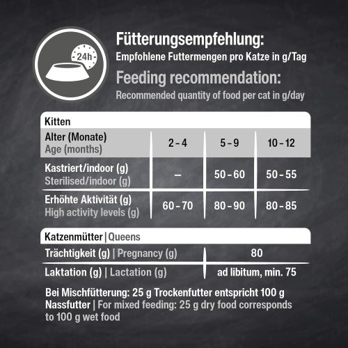 Bei Mischfütterung: 25g Trockenfutter ersetzen etwa 100g Feuchtnahrung.