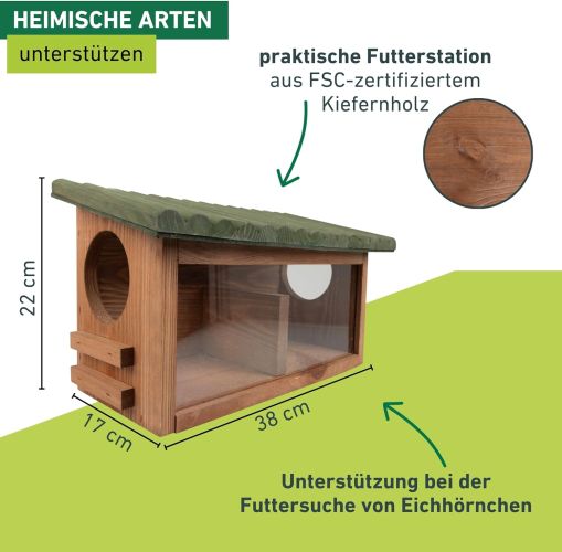 - EIN BUFFET FÜR EICHHÖRNCHEN – Mit der praktischen Futterstation aus FSC-zertifiziertem Kiefernholz können die kletterfreudigen Nager bei der Futtersuche unterstützt werden