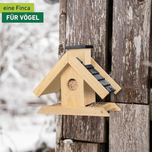 Dieser Finca statten Wildvögel in Ihrem Garten liebend gerne einen Besuch ab. Mit dem schön gestalteten Vogelhaus aus massivem Kiefernholz unterstützen Sie aber nicht nur die heimische Vogelvielfalt bei ihrer Futtersuche, sondern schaffen zudem einen dekorativen Hingucker in Ihrem Garten. Das witterungsbeständige Häuschen kann ganz einfach über den Kamin mit Vogelfutter befüllt werden, welches im Inneren dank praktischer Silobauweise stets trocken bleibt. Zudem können Vögel so ihr Geschäft nicht im Futter verrichten, was die Verbreitung von Krankheiten verhindert. Unter dem robusten, überstehenden Dach können es sich die Vögel auf den angebrachten Sitzstangen bequem machen. Der Futterstand ist jederzeit über das kleine Sichtfenster einsehbar, um die Finca bei Bedarf wieder mit Nachschub aufstocken zu können.