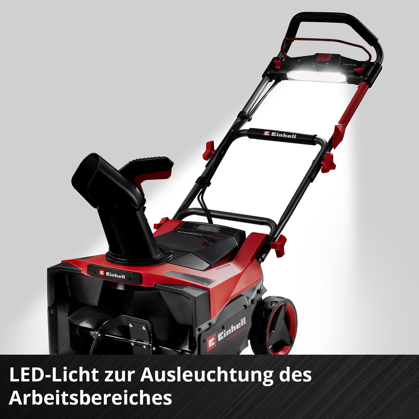 Die Richtung der Schneefräse (± 220°) lässt sich elektrisch direkt über einen Schieber am Holm verstellen, der obere Teil des Auswurfschachts lässt sich manuell verstellen, um Wurfwinkel und -höhe nach Bedarf bis zu 8 Metern einzustellen. Auch die Geschwindigkeit lässt sich stufenlos über einen Schieber am Holm regulieren, wodurch sich das Gerät an unterschiedliche Schneeverhältnisse anpassen lässt. Die LED-Anzeige am Schiebegriff zeigt die verbleibende Akkulaufzeit auf einen Blick an. Zusätzlich verfügt der Holm über eine integrierte LED-Lichtleiste, die über einen separaten Knopf ein- und ausgeschaltet werden kann. Zur einfachen Aufbewahrung lässt sich der Holm zusammenklappen. Der ergonomische Softgrip-Griff verfügt über einen Zweipunkt-Sicherheitsschalter, der ein unbeabsichtigtes Starten verhindert.