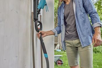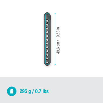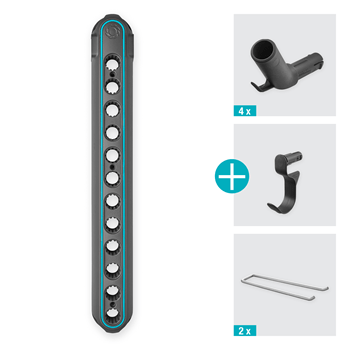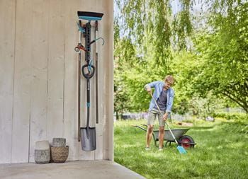Mit der GARDENA combisystem-Geräteleiste Flex kannst Du Deine GARDENA combisystem Geräte und Stiele bequem und platzsparend aufbewahren. So sorgst Du für eine optimale Aufbewahrung und kannst Unordnung in Deinem Schuppen vermeiden. Die Geräteleiste Flex ist mit vier Gerätehaltern ausgestattet, inklusive eines kleinen Hakens zum Aufhängen von Scheren oder Kleingeräten. Die Gerätehalter sind flexibel sowie frei steckbar und Du kannst sie in 30°-Schritten rotieren, um die Position an Deine Bedürfnisse flexibel anzupassen. Die Stecker eignen sich für die Lagerung Deiner Geräte aus dem GARDENA combisystem wie auch aus dem Original GARDENA System. Mit dem ebenfalls enthaltenen Universalhaken bewahrst Du Gartengeräte wie Spaten auf. Du kannst die Geräteleiste sowohl vertikal wie auch horizontal ausrichten, um den Platz an Deiner Wand optimal zu nutzen. Zudem bietet die Geräteleiste dank der Metallbügel Platz für bis zu vier Stiele aus dem GARDENA combisystem. Wenn Du noch mehr Geräte und Werkzeuge lagern möchtest, erweiterst Du die Leiste mit dem Einzelstecker Flex (Art.-Nr. 3507-20). Stiele, die nicht dem combisystem angehören, können mit dem Stielhalter Flex (Art.-Nr. 3508-20) aufbewahrt werden. Die combisystem-Geräteleiste Flex wird von GARDENA mit 25 Jahren Herstellergarantie nach Registrierung unter gardena.com/registration innerhalb von 3 Monaten nach Kauf unterstützt. Lass Deine Werkzeug-Familie wachsen. GARDENA combisystem. Auswechselbar. Langlebig. Für alle Gartenarbeiten.