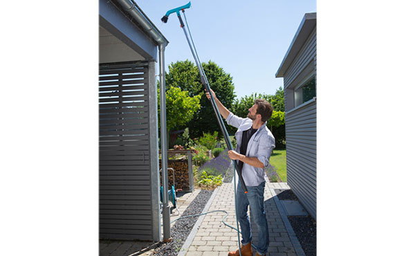 Mit dem GARDENA combisystem-Dachrinnenreiniger können Sie optimal und einfach Dachrinnen säubern und ausräumen. Das GARDENA combisystem ermöglicht dank der auswechselbaren Aufsätze den flexiblen Einsatz in der Gartenarbeit. Der Dachrinnenreiniger ist mit allen Stielen aus dem GARDENA combisystem kompatibel und kann im jeweiligen Stiel eingesteckt und festgeschraubt werden. Für den Einsatz in bis zu fünf Metern Höhe empfehlen wir Ihnen den combisystem-Teleskopstiel (Art.-Nr. 3721-20). Durch die sichere Verbindung von Reiniger und Stiel ist ein wackelfreies und zuverlässiges Arbeiten jederzeit garantiert. Der integrierte Handgriff erleichtert die komfortable Benutzung auch ohne Stiel. Die stabilen Borsten auf der einen Seite sowie zwei robuste Schaber aus hochwertigem Kunststoff auf der anderen Seite sorgen dafür, dass Sie effektiv arbeiten können. Die Reinigung der Dachrinne mit Wasser ist ebenfalls möglich: Ein Original GARDENA System Anschluss ist integriert, an den Sie einfach den Gartenschlauch anschließen können. Um die Dachrinne bequem zu erreichen, können Sie den Arbeitswinkel mit dem Schnellverschluss individuell anpassen. Kombinieren Sie das Qualitätsprodukt zur platzsparenden Aufbewahrung mit der combisystem-Geräteleiste Flex (Art.-Nr. 3505-20). Der combisystem-Dachrinnenreiniger von GARDENA hat eine 25 Jahre lange Herstellergarantie nach Registrierung unter gardena.com/registration innerhalb von 3 Monaten nach Kauf. Lassen Sie Ihre Werkzeug-Familie wachsen. GARDENA combisystem. Auswechselbar. Langlebig. Für alle Gartenarbeiten.