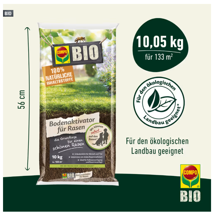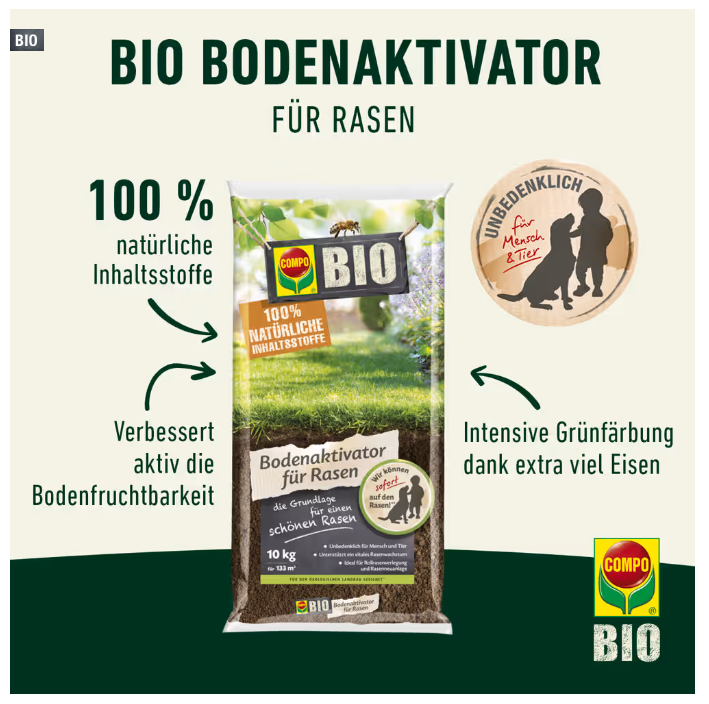Der COMPO BIO Bodenaktivator für Rasen ist für den ökologischen Landbau geeignet und ist komplett unbedenklich für Mensch und Tier.