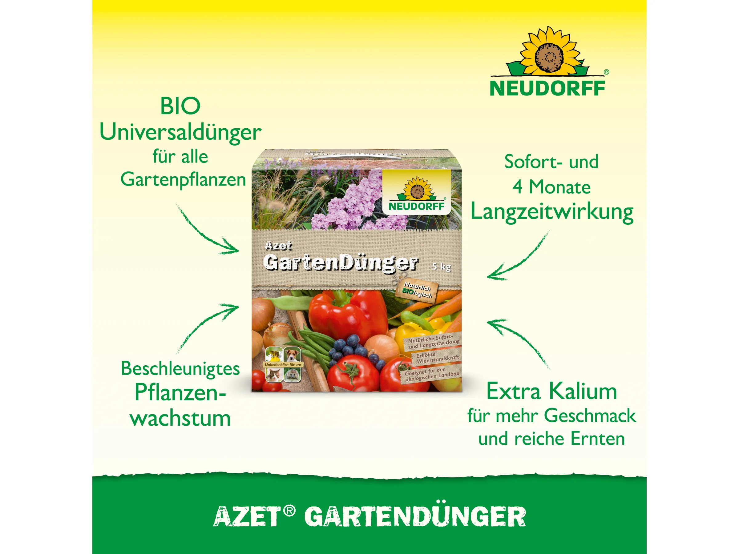 Azet GartenDünger hat einen NPK-Wert von 7-3-6 und ist ein organischer Volldünger für alle Pflanzen und optimal für den Einsatz im Freiland geeignet. Neben Nährstoffen und Spurenelementen enthält Azet GartenDünger MyccoVital. Die Mykorrhiza-Pilze verbessern das Wurzelwachstum, die Pflanzen nehmen mehr Nährstoffe und Wasser auf. Dadurch erhöht sich die Widerstandskraft der Pflanzen. Die Blühkraft und der Ernteertrag werden gefördert. Die im Azet GartenDünger enthaltenen Mikroorganismen wandeln Nährstoffe um und verbessern so die Düngerwirkung kontinuierlich und bedarfsgerecht.