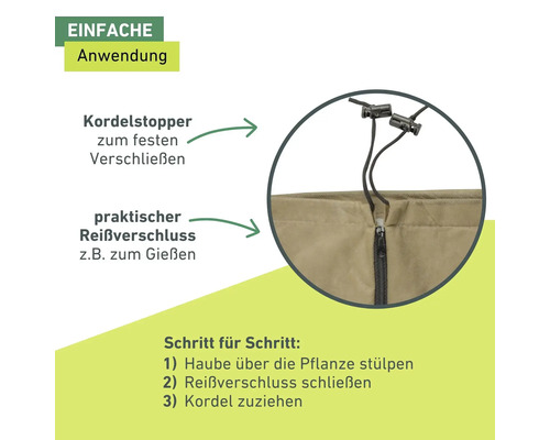 Die Kordel und der Reißverschluss machen ein besonders schnelles Anbringen des Winterschutzes und ein einfaches Gießen der Pflanze möglich. Dank der Kordelstopper öffnet sich die zugezogene Kordel auch bei starken Umwelteinflüssen nicht – der Winterschutz bleibt an Ort und Stelle.