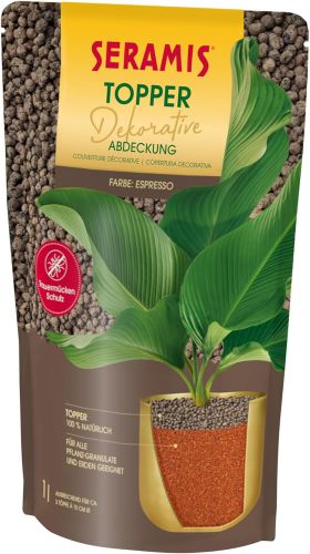 Der Seramis Topper Espresso verleiht Pflanzgefäßen eine elegante Optik und bietet gleichzeitig zuverlässigen Schutz. Die dekorative Abdeckung eignet sich hervorragend zum Abdecken von Blumenerde sowie sämtlichen Pflanz-Granulaten und sorgt für eine ordentliche, ansprechende Oberfläche im Topf.