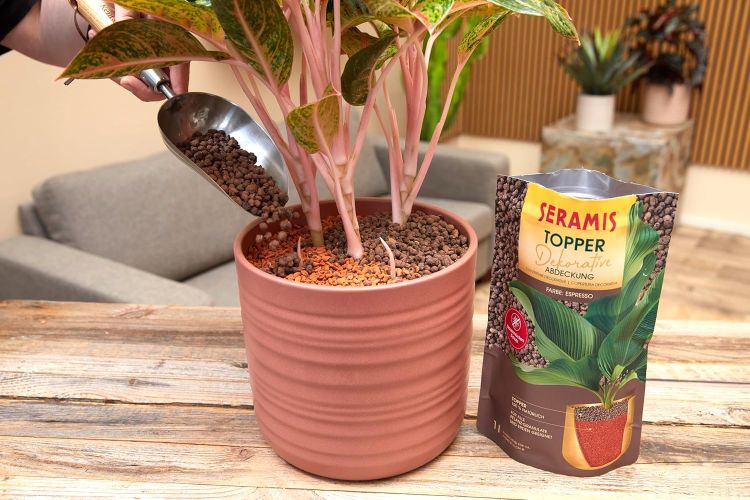 Die Anwendung ist besonders einfach: Das Material gleichmäßig auf das vorhandene Substrat aufstreuen – fertig. Ein Liter reicht für etwa drei Pflanzgefäße mit jeweils 15 cm Durchmesser. So verbindet der Seramis Topper Espresso dekoratives Design mit funktionalem Pflanzenschutz für ein gepflegtes Zuhause.