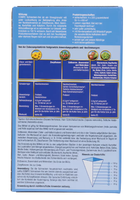 Nacktschnecken an Blumenkohl, Kopfkohle (Weiß-, Rot-, Spitz-, Rosen- und Wirsingkohl), Brokkoli; Kohlrübe; Beten (Rote, Gelbe, Weiße Bete); Spinat; Salat-Arten; Hülsengemüse; Kartoffeln; Zuckermais; frische Kräuter und Zierpflanzen sowie Nacktschnecken, Garten-Schnirkelschnecke (Cepaea hortensis), Hain-Schnirkelschnecke (Cepaea nemoralis), Östliche Heideschnecke (Xerolentia obvia) an Erdbeeren, Beerenobst, Weinreben (Nutzung als Tafel- und Keltertrauben) im Freiland und Gewächshaus (nur Zierpflanzen). Das Mittel ist giftig für Weinbergschnecken. Bei einem Vorkommen von Weinbergschnecken (Helix pomatiaund Helix aspersa) darf das Mittel nicht angewendet werden.