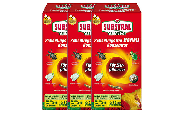 Zusätzliche Hinweise zur Anwendung: SUBSTRAL® Celaflor® Schädlingsfrei Careo Konzentrat ist in der Regel gut pflanzenverträglich. Da bei der großen Anzahl der Pflanzenarten und -sorten unterschiedliche Verträglichkeiten auftreten können, empfiehlt es sich, vor der Spritzung des gesamten Bestandes die Empfindlichkeit an einzelnen Pflanzen zu prüfen und über einen Zeitraum von ca. 10 Tagen zu beobachten. Keine Anwendung bei hohen Temperaturen (>25°C) oder direkter Sonneneinstrahlung.