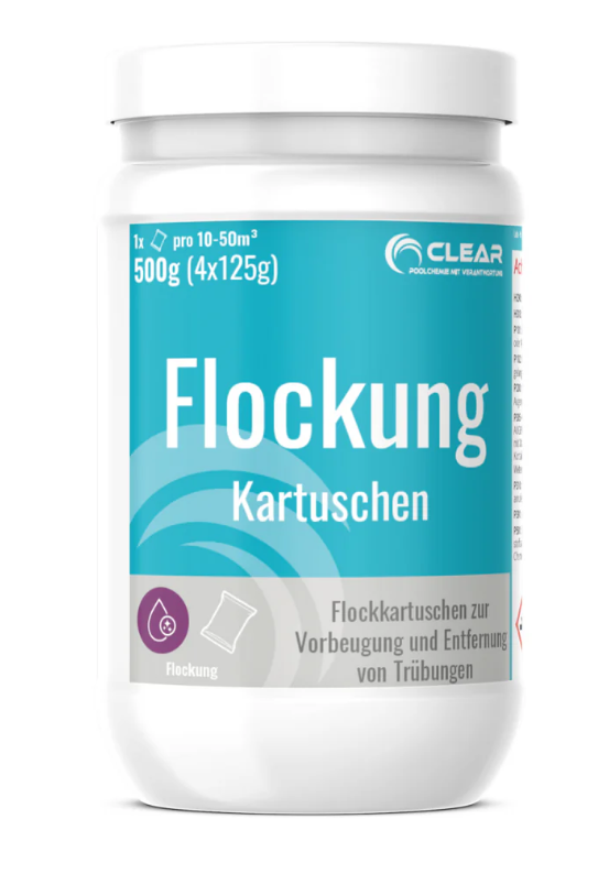 Vor der Zugabe muss der pH-Wert überprüft und wenn nötig mit pH-Minus oder pH-Plus auf den Idealbereich von 7,0-7,4 eingestellt werden. Die Flockkartusche kann wöchentlich nach der Rückspülung in den Skimmer gelegt werden.