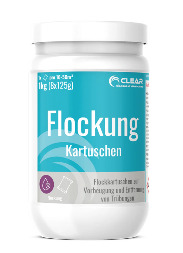 Vor der Zugabe muss der pH-Wert überprüft und wenn nötig mit pH-Minus oder pH-Plus auf den Idealbereich von 7,0-7,4 eingestellt werden. Die Flockkartusche kann wöchentlich nach der Rückspülung in den Skimmer gelegt werden.
