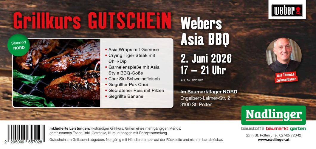 Gutschein am Grillabend abgeben. Nur gültig mit Händlerstempel auf der Rückseite und nicht in bar ablösbar.