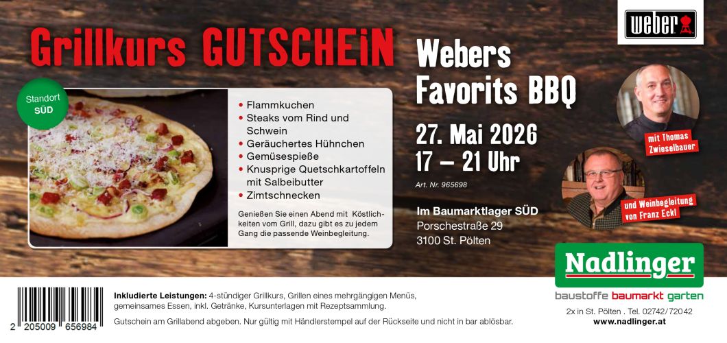 Webers GRILLKURS Favorits BBQ 27.05.26, bei Nadlinger Süd, 270526
