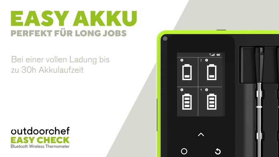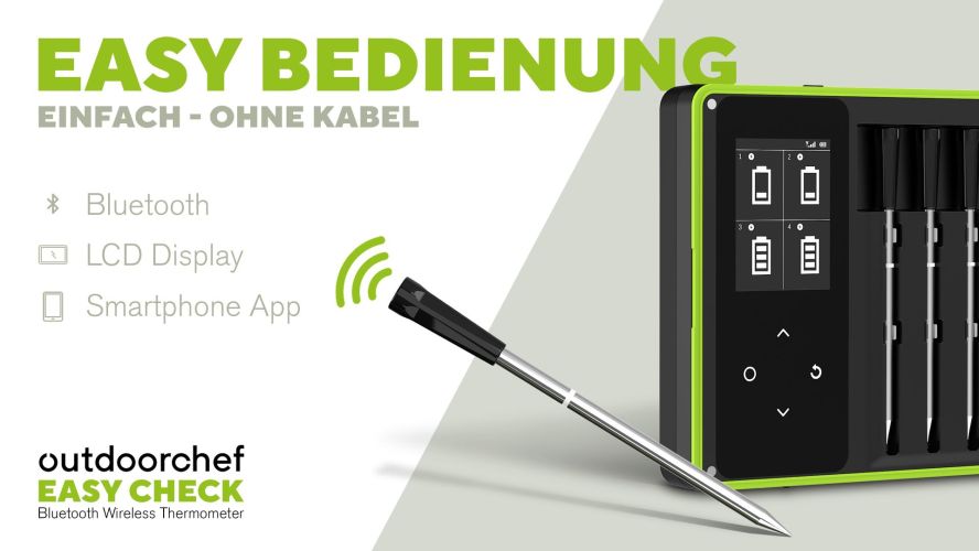 Das Easy Check Bluetooth Grillthermometer ist mit allem ausgestattet, was ein funktionelles Thermometer ausmacht! Kabellos und extra schmal werden die beiden nur 5 mm dicken Temperaturfühler direkt im Grillgut platziert. Die Kern- sowie Garraumtemperatur können nun direkt am Display im Multifunktions-Dock abgelesen werden. Die Reichweite zwischen Fühlern und Dock beträgt hier bis zu 50 Meter. Für die maximale Reichweite von bis zu 200 Metern wird das Dock einfach mit dem Smartphone verbunden und liefert nun als Repeater nochmal bis zu 150 Meter mehr Reichweite. Mit der durchdachten Smartphone App stehen zusätzlich viele weitere bewährte Einstellungsmöglichkeiten und Alarm-Funktionen zu Verfügung.