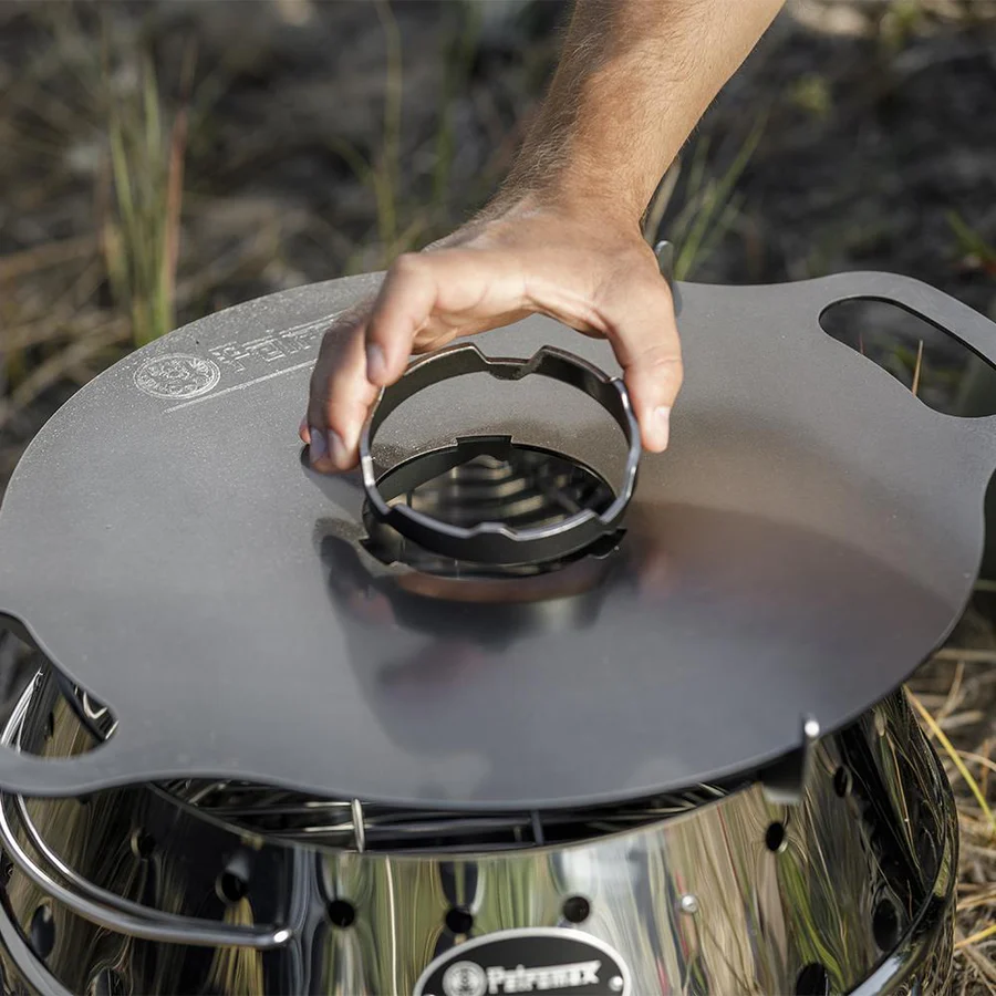 Der Petromax Kochaufsatz für die Atago Grillplatte ist deine flexible Ergänzung für das Grillen auf der Plancha-Platte: Der Kochaufsatz fügt sich genau in die Aussparung deiner Grillplatte ein und sorgt dafür, dass das Grillgut sicher auf der Platte bleibt. Darüber hinaus dient der Aufsatz für direkten Flammenkontakt zur Zubereitung von Saucen, Suppen, Pfannengerichtn oder Kaffee, während deine stärkende Mahlzeit auf der Atago Grillplatte brutzelt. So hast du mit einem kleinen Feuertopf, Saucentopf oder einer Kasserolle die Möglichkeit, eine Grillsauce, eine deftige Vorsuppe oder eine würzige Beilage zuzubereiten. Anschließend kannst du mit dem Perkolator einen aromatischen Kaffee kochen oder mit der kleinen Teekanne einen Wildkräutertee.