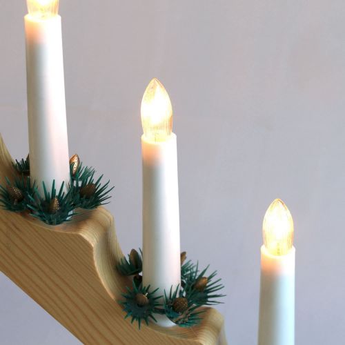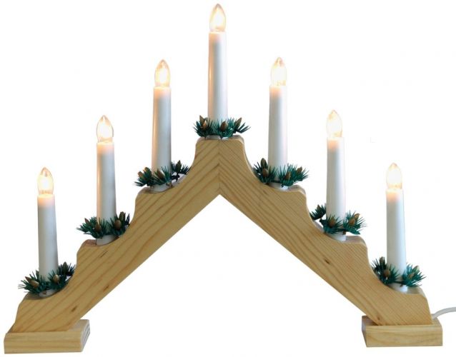Eine stimmungsvolle Lichterdekoration mit 7 warmweißen Lichtern. Ideal zur weihnachtlichen Tisch- und Fensterbankdekoration. Der Lichterbogen wird klassisch über den 230V Stromanschluss mit Energie versorgt. Der naturfarbene Holzkorpus ist pflegeleicht und standfest verarbeitet.