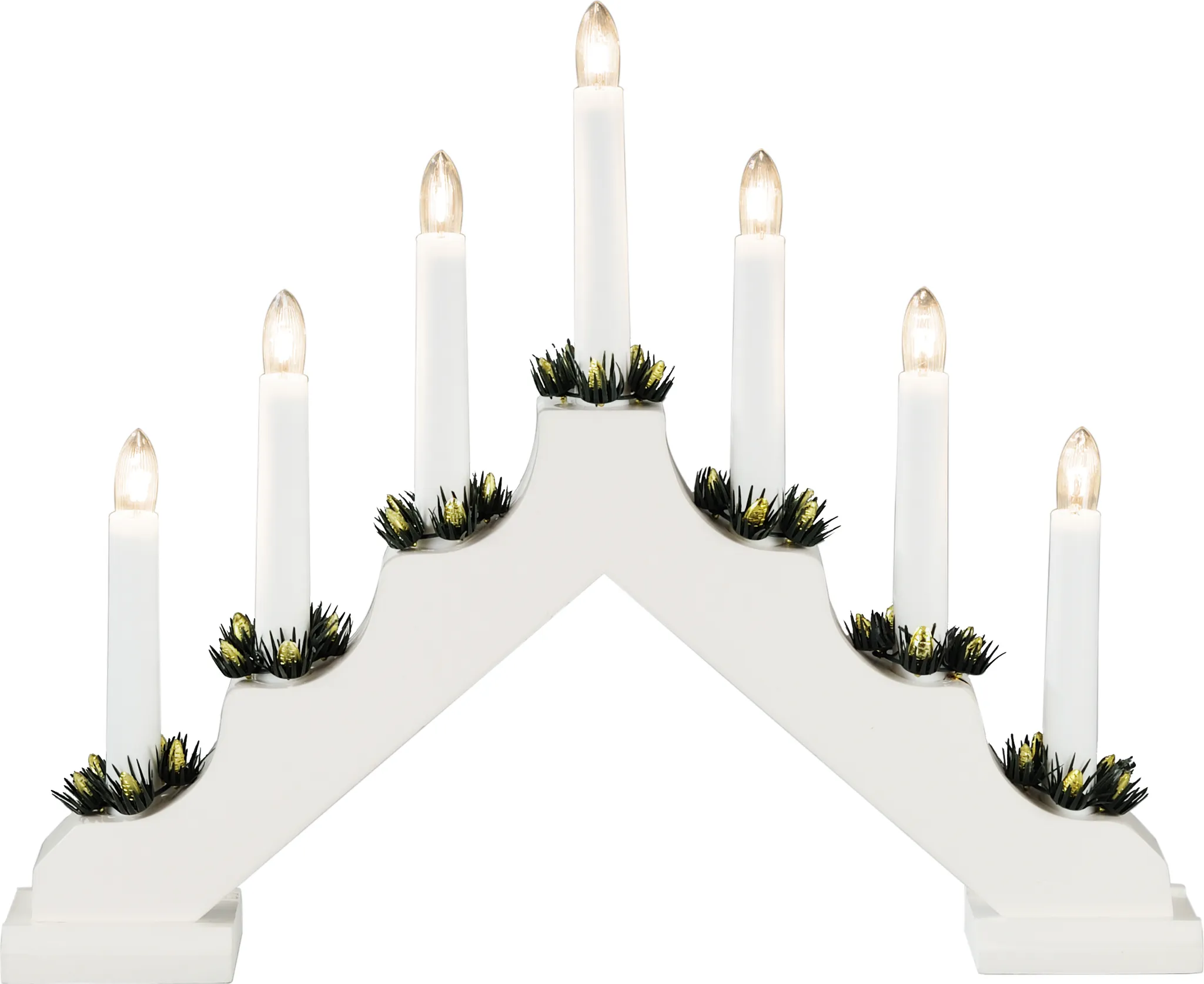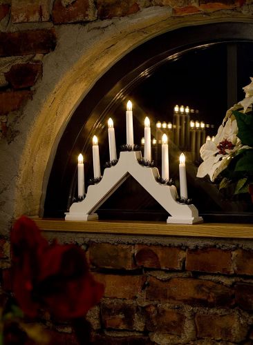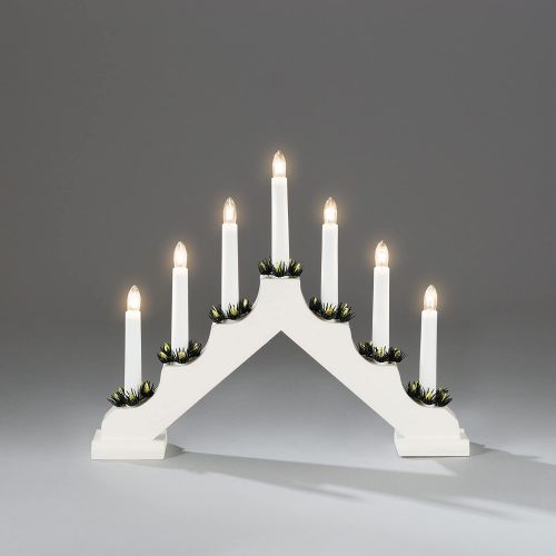Dieser weiß lackierte, mit 7 klaren Birnen ausgestattete Holzleuchter sorgt im inneren von Haus oder Wohnung für eine ganz besonders stimmige Atmosphäre in der Weihnachtszeit.