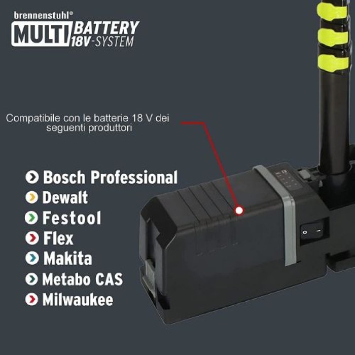 Der leuchtstarke Multi Battery LED Akku Teleskop Arbeitsstrahler 6050 MA ist dank brennenstuhl® Multi Battery 18V System kompatibel mit verschiedenen 18V Akkus (verschiedene Ah Klassen) der sieben Powertool-Hersteller Bosch Professional, Dewalt, Festool, Flex, Makita, Metabo CAS und Milwaukee.