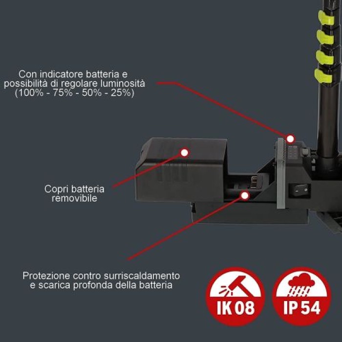 Der robuste Stativ-Baustrahler eignet sich perfekt für den anspruchsvollen und den robusten Einsatz im Innen- und Außenbereich. Durch die Schutzart IP54 ist die höhenverstellbare Arbeitsleuchte mit neigbarem Strahlerkopf bestens vor Staub und Spritzwasser geschützt.