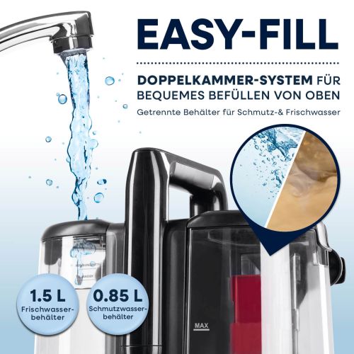 - FLEXIBEL & KOMFORTABEL: Mit 1,2-m-Schlauch, 4-m-Kabel, Dual-Tank (850-ml-Schmutz- & 1,5-l-Frischwassertank) & Easy-Fill