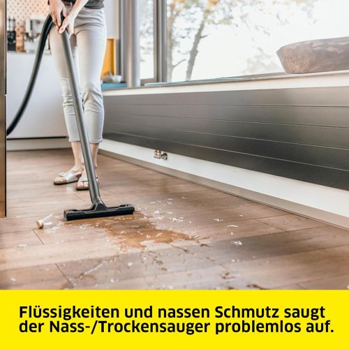 Der WD 3 V-17/4/20 ist saugstark und energieeffizient bei nur 1000 Watt Nennleistungsaufnahme. Dabei sind sowohl das Gerät als auch der Saugschlauch und die Clips-Bodendüse optimal aufeinander abgestimmt – für die besten Reinigungsergebnisse bei trockenem, nassem, feinem oder grobem Schmutz. Der Nass-/Trockensauger punktet mit seiner kompakten Bauweise und einem robusten 17-Liter-Kunststoffbehälter, 4 m Kabel, 2 m Saugschlauch und seinem Vliesfilterbeutel. Dank des einteiligen Patronenfilters ist das Aufsaugen von sowohl nassem als auch trockenem Schmutz ohne Filterwechsel möglich. Die Blasfunktion ist nützlich beim Reinigen von schwer zugänglichen Stellen. Die Aufbewahrung des Schlauchs erfolgt platzsparend durch das Einhängen am Gerätekopf. Das Kabel kann am Kabelhaken verstaut werden, Rohre und Bodendüsen am Bumper. Das „Pull & Push“-Verschlusssystem ermöglicht einfachstes Öffnen und Schließen des Behälters. Der Handgriff des Saugers kann abgenommen und das Zubehör direkt auf den Saugschlauch gesteckt werden. Ebenfalls clever: Auf der Fläche auf dem Gerätekopf können Werkzeuge oder Kleinteile abgelegt werden. Der ergonomisch geformte Tragegriff ermöglicht den komfortablen Transport.