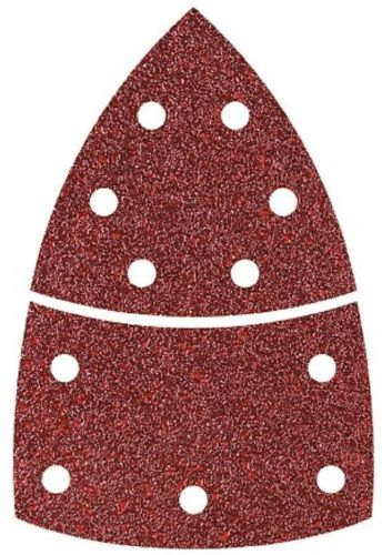 10 Haft-Schleifblätter Korund Korn 120, gelocht; 2-teilig: Dreieck-Schleifblatt 95 mm + Basis-Schleifblatt, für Multischleifer Bosch PSM 160 A, PSM 80 A, Prio, Ventaro; Metabo FMS 200 Intec; Skil Octo.