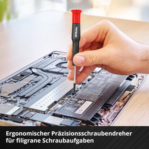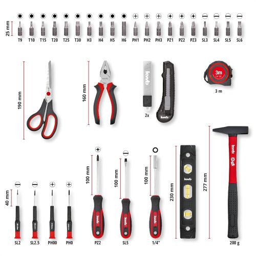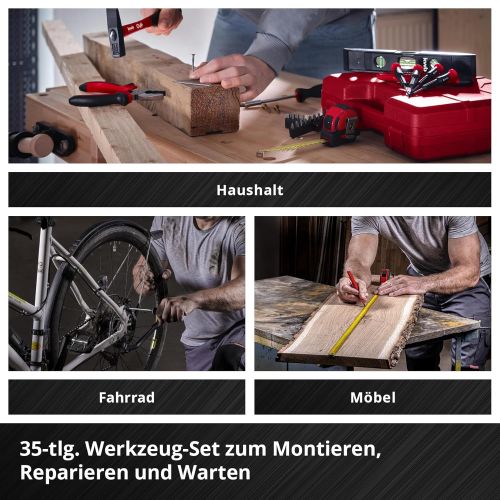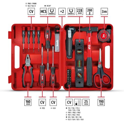 Der 35-teilige, handliche kwb Werkzeugkoffer wurde für den Haushaltseinsatz konzipiert. Er enthält vier Präzisionsschraubendreher, eine robuste, multifunktionale Kombizange, Kreuz- und Schlitzschraubendreher aus CV-Stahl, ein 3-m-Maßband, einen Schlosserhammer mit Fiberglasgriff und eine Universalschere. Ein Bitschraubendreher, Abbrechklingenmesser mit Ersatzklingen, eine Wasserwaage mit Magnetstreifen und eine Bithalterschiene mit 20 25-mm-Bits aus CV-Stahl runden das Set für Heimwerker ab.